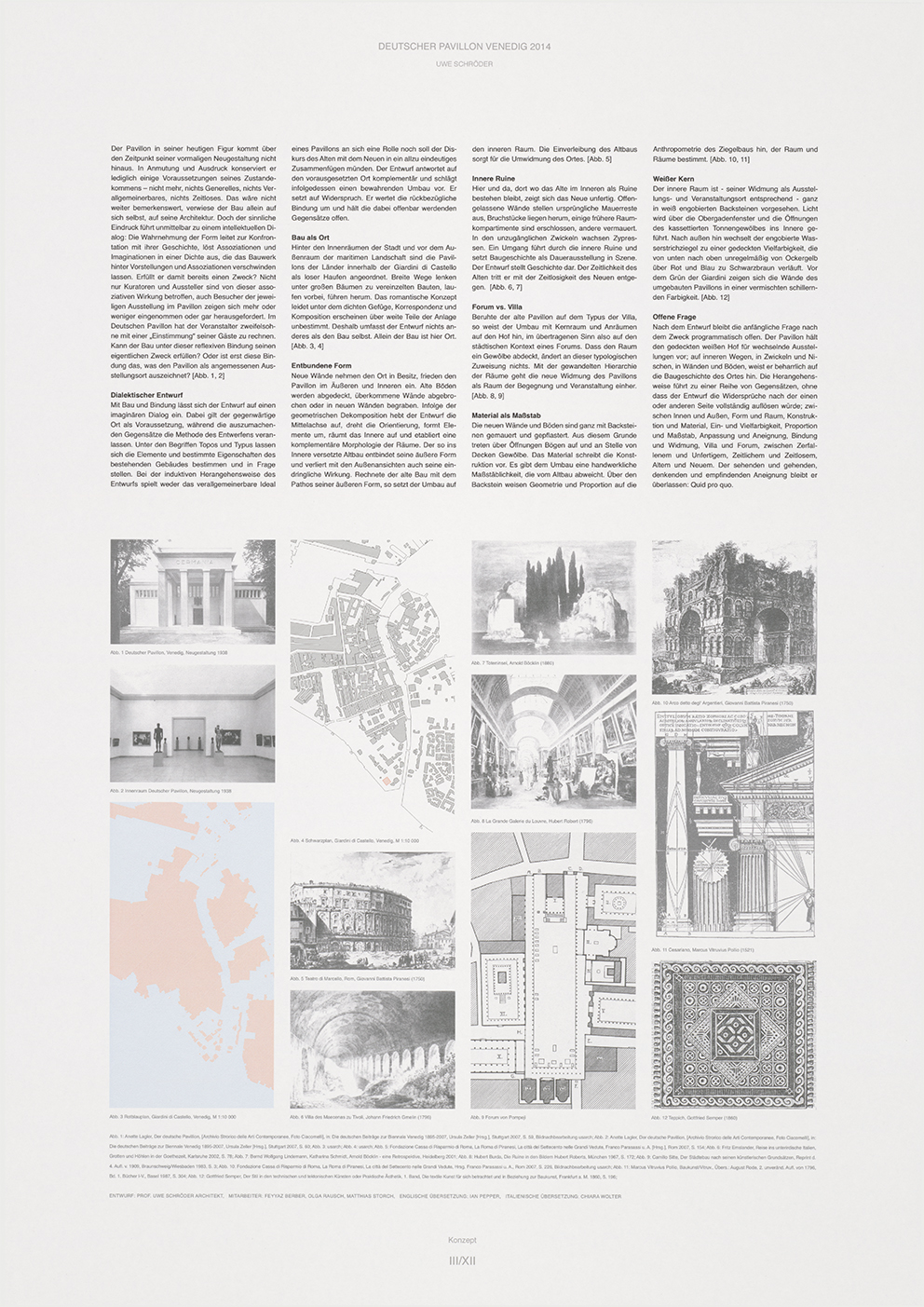 Nach dem Entwurf bleibt die anfängliche Frage nach dem Zweck programmatisch offen. Der Pavillon hält den gedeckten weißen Hof für wechselnde Ausstellungen vor; auf inneren Wegen, in Zwickeln und Nischen, in Wänden und Böden, weist er beharrlich auf die Baugeschichte des Ortes hin. Die Herangehensweise führt zu einer Reihe von Gegensätzen, ohne dass der Entwurf die Widersprüche nach der einen oder anderen Seite vollständig auflösen würde; zwischen Innen und Außen, Form und Raum, Konstruktion und Material, Ein- und Vielfarbigkeit, Proportion und Maßstab, Anpassung und Aneignung, Bindung und Widmung, Villa und Forum, zwischen Zerfallenem und Unfertigem, Zeitlichem und Zeitlosem, Altem und Neuem. Der sehenden und gehenden, denkenden und empfindenden Aneignung bleibt er überlassen: Quid pro quo.