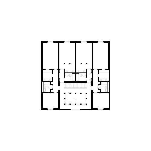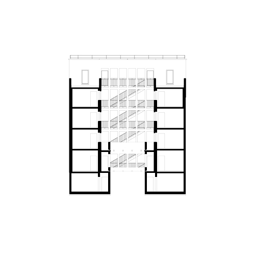 Der Entwurf reflektiert die Ordnung des Quartiers ebenso wie die Wohnbedürfnisse seiner Bewohner. Auf diese beiden Faktoren verweist das städtische Wohngebäude in seiner formalen und räumlichen Durchbildung. Das umgebende urbane Gefüge markiert eine Schnittstelle von dichter Blockrand- und aufgelockerter Zeilenbebauung. Findet sich im Osten ein Geflecht von Gassen und schmal parzelliertem Baugrund, so lockert sich die Bebauung im Westen auf. Konturieren dort die Häuser zur Straßenseite hin klare Blockränder, so finden sich hier mehrere einzelnstehende Großbauten, und auch die Wohnhäuser zeugen durch ihre Zeilenanordnung von einer Wandlung städtebaulicher Leitbilder im 20. Jahrhundert. Der Block, in dessen Randbebauung sich das Wohngebäude einreiht, spiegelt diese Situation im Kleinen: Dort, wo das Haus seinen Platz in einer Baulücke findet, stehen die Häuser Seite an Seite und geben dem Straßenraum eine scharfe Kontur. Im Nordosten aber bricht dessen Rand auf, und Solitärbauten lassen die auf der gegenüberliegenden Seite so klar vollzogene Trennung von Straße und Blockinnerem verwischen. Das Wohngebäude reiht sich in das Bestehende ein und stärkt mit der Baulückenschließung den Block. Durch formale Überhöhung des Blockrandes in Form einer von zwei Türmen flankierten Klinkerwand kommt diese Idee bildhaft zum Ausdruck. Doch der städtische Außenraum geht über die Grenze dieser Wand hinaus: die mittlere Fassade tritt von der Straßenflucht zurück und eröffnet im Erdgeschoss ein Atrium. In dieser Fassade ist mithilfe von Laubengängen respektive Loggien ein vermittelnder Übergang von Außen und Innen angelegt. Im Inneren schließlich, in den auf fünf Etagen angelegten Wohnungen, findet das Private zu seinem Recht. Das städtische Wohngebäude lockert mit räumlicher Differenzierung die Grenzziehung zwischen Stadt und Haus auf, ohne dabei die Ordnung der ersteren noch die Bedürfnisse des letzteren zu opfern.